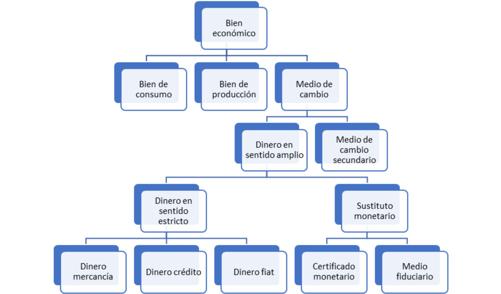 Das Geld im weiteren Sinne wiederum besteht aus dem „Geld im engeren Sinne“ und den Geldsubstituten. Der Unterschied zwischen beiden besteht darin, dass Geld im engeren Sinne — das, was wir heute „Geldbasis“ nennen würden — die Güter sind, die eigentlich als allgemeines indirektes Tauschmittel verwendet werden, während Geldsubstitute in Geld im engeren Sinne zahlbare Forderungsrechte sind, die es in seinen Funktionen ersetzen. Das Geld im engeren Sinne wiederum unterteilt sich in Warengeld, Kreditgeld und Fiatgeld (S. 61), während die Geldsubstitute in Geldzertifikate und Umlaufmittel untergliedert werden (S. 133).