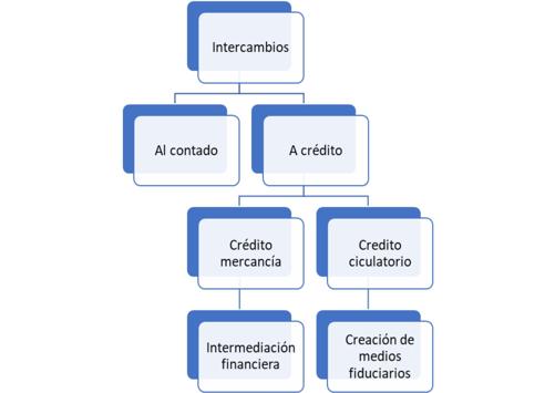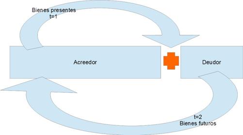 Warenkredit sind intertemporale Tauschvorgänge, bei denen eine Gläubigerpartei das Recht erwirbt, künftige Güter zu erhalten, um den Preis, dass sie darauf verzichtet, über gegenwärtige Güter zu verfügen, damit ihre schuldnerische Gegenpartei über jene gegenwärtigen Güter verfügen kann, auf die sie verzichtet. Wenn Pedro zum Beispiel 50 Unzen Gold hat und sie Juan für sechs Monate leiht, erlangt Juan für sechs Monate die Kontrolle über 50 Unzen Gold weil Pedro die Kontrolle darüber verloren hat (und dafür etwa am Ende des Zeitraums 55 Unzen Gold zurückerhält): Wir haben es mit einer Art kreditmäßiger „Nullsummensituation“ zu tun, nämlich damit, dass die Verfügung über gegenwärtige Güter, die Juan gewinnt, jene ist, die Pedro verliert.