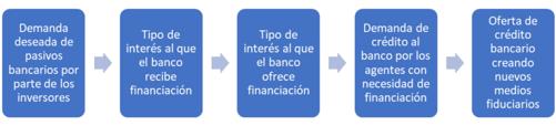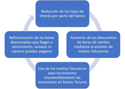Beim Zirkulationskredit hingegen kann eine Partei der anderen gegenwärtige Güter leihen, ohne auf die Verfügung über irgendein gegenwärtiges Gut zu verzichten. Das heißt, die Vorteile, die die schuldnerische Gegenpartei erlangt, werden nicht durch die Opfer ausgeglichen, die die Gläubigerpartei erfährt. Wenn Pedro zum Beispiel auf Sicht zahlbare Scheine im Wert von 50 Unzen druckt und sie Juan für sechs Monate leiht, wird Pedro nicht auf die Verfügung über irgendein gegenwärtiges Gut verzichtet haben, da die verliehenen Scheine aus dem Nichts geschaffen wurden, und dennoch werden diese Scheine gesellschaftlich so akzeptiert, als ob sie Geld wären, da es sich um Geldsubstitute handelt[1].