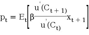 [22] Typischerweise stellen wir den Wert eines Aktivums dar als (Cochrane 2001 [2005], S. 4), wobei der Preis eine Funktion der Erwartungen künftiger Cashflows und eines Diskonts ist, der durch das Verhältnis der Nutzen zwischen Gegenwart und Zukunft sowie durch die Zeitpräferenz gegeben ist.